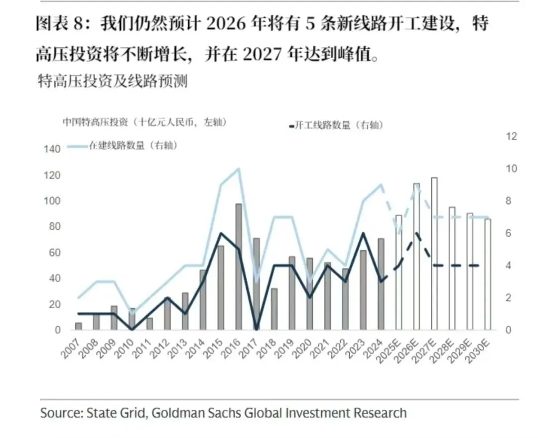 2026 年:特高压将成为增长最快的板块,预计同比增速达 24%。高盛预测 2026 年将有 5 条新特高压线路开工建设,而 2027-2030 年每年新开工线路将降至 4 条,因此 2026 年将是特高压投资的短期峰值年。特高压作为跨区域电力传输的核心载体,是解决 “西电东送”“北电南供” 的关键,也是提升电网跨区域、跨省输电能力的核心抓手。