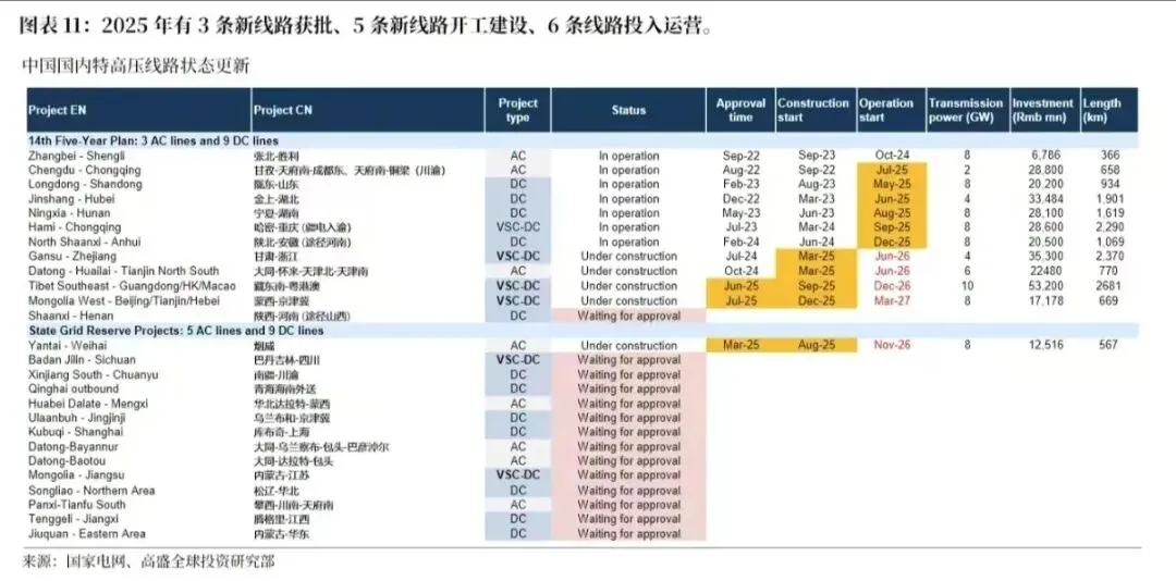 2025 年 1-11 月,国家电网披露的电网投资达 5604 亿元,同比增长 6%。根据过去三年的季节性规律,高盛预测 2025 年全年电网投资同比增速将达到 11%,但这一数据仍低于高盛最初预期的 13%(6900 亿元),呈现出温和增长的态势。