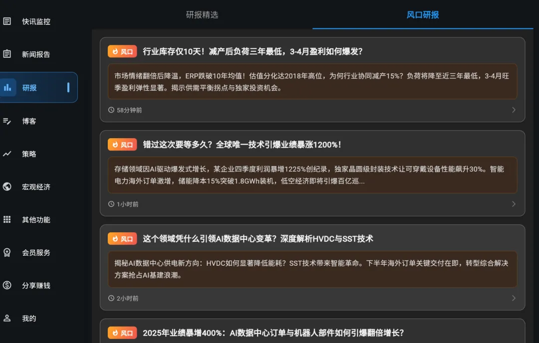 消息系统的研报板块为大家更新了风口研报功能。