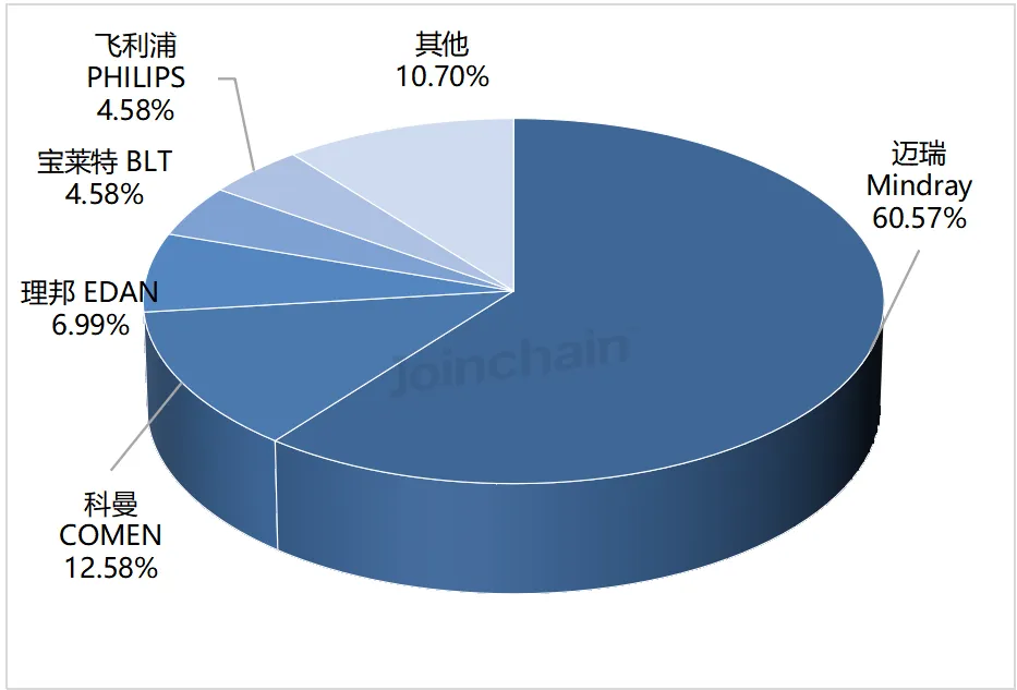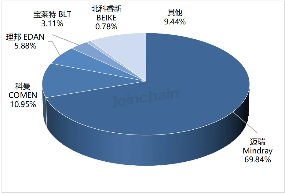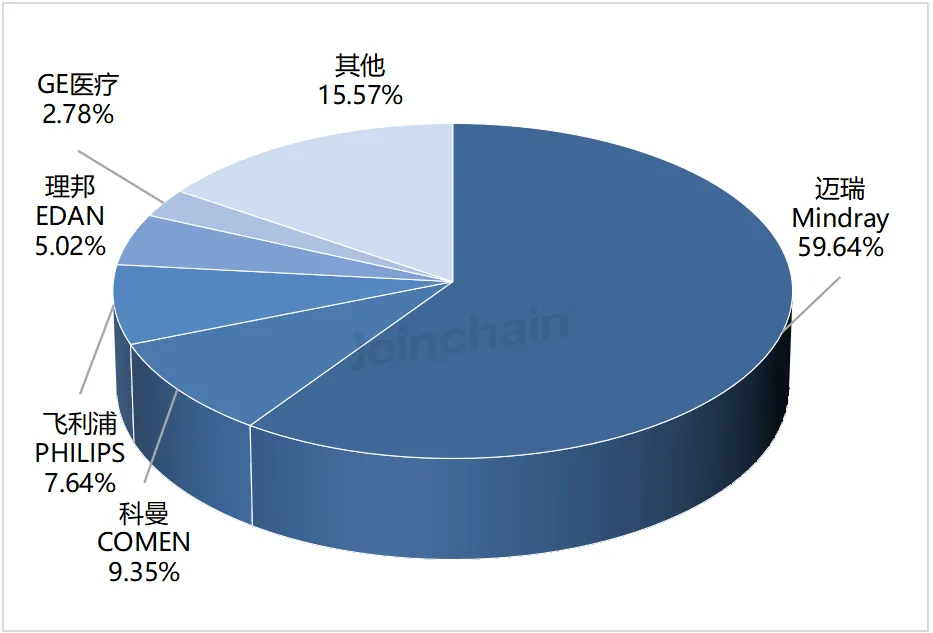 2025年监护设备国产品牌采购金额占比排名前三的分别为迈瑞、科曼和理邦,三者之和占国产品牌总和的86.66%。