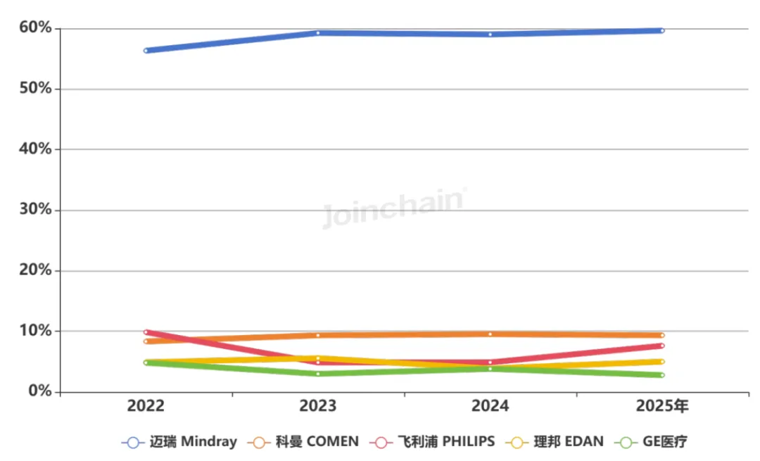 图表3 2022-2025年我国监护设备TOP5品牌市场占比趋势情况(按金额)