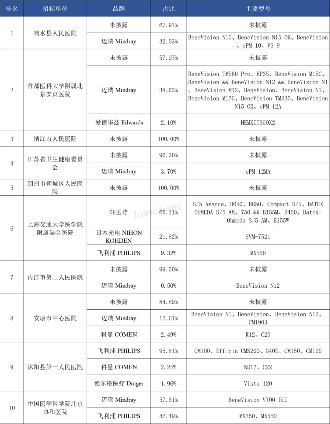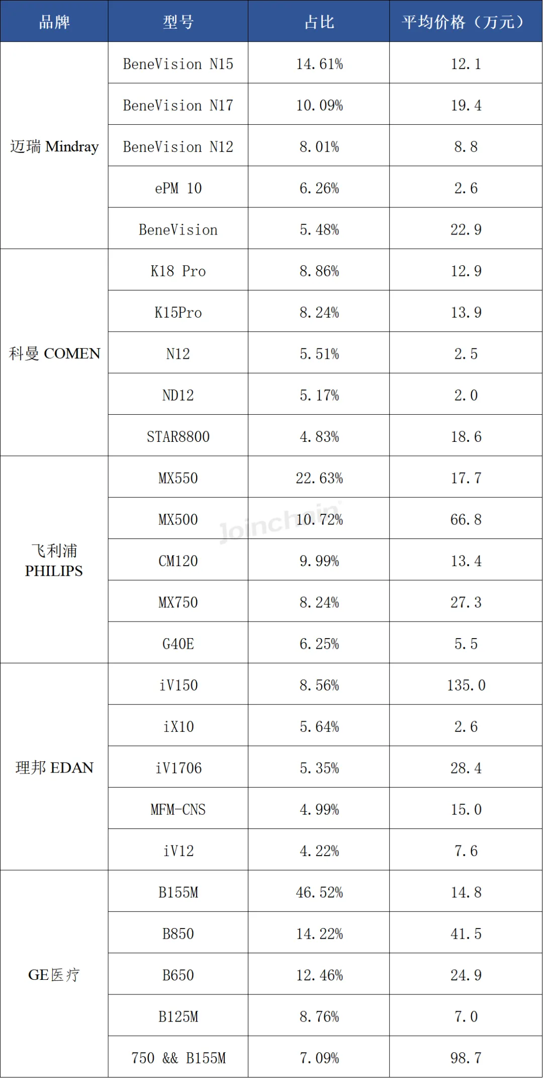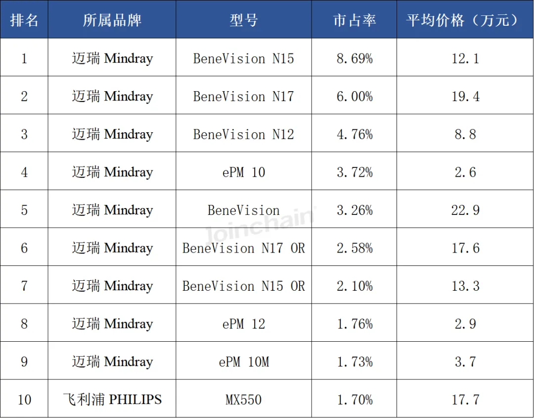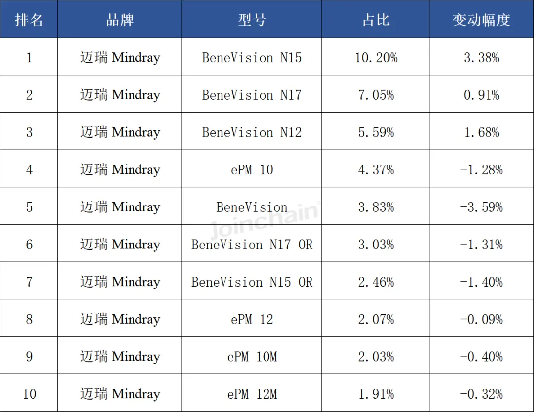 从具体型号上看,排名前三的型号分别来自迈瑞的BeneVision N15、迈瑞的BeneVision N17和迈瑞的BeneVision N12。