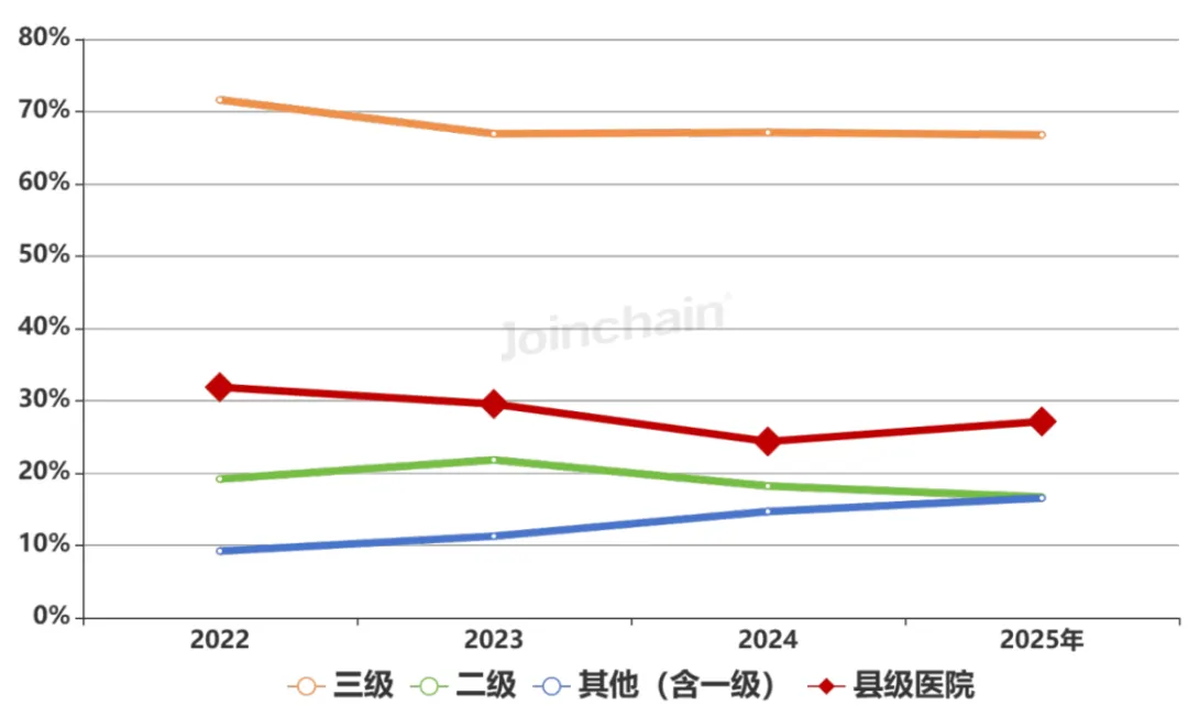 从采购单位类型上看,2025年三级医院、二级医院采购占比分别为66.77%、16.67%;县级医院采购占比为27.13%。各类型采购单位采购占比趋势变化如图表6所示。