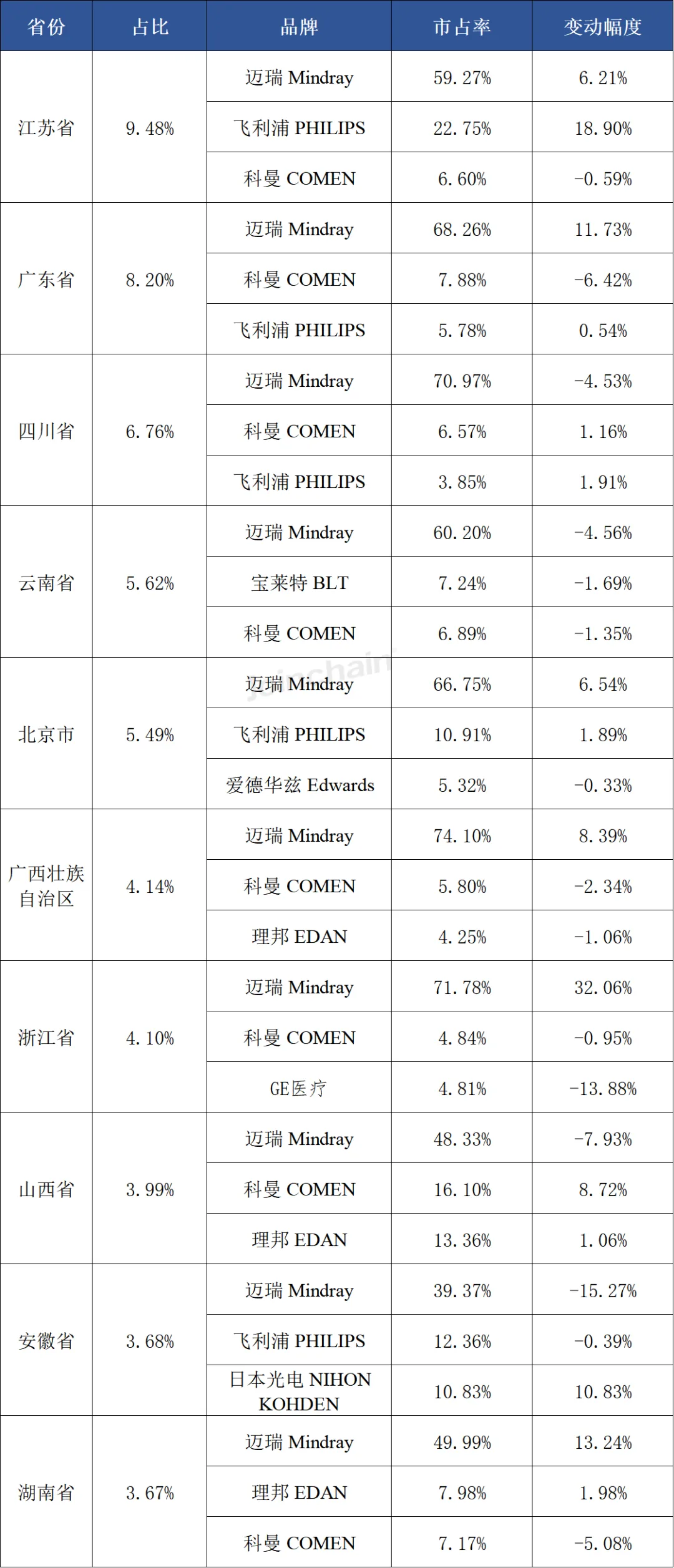 从各省份品牌来看,前十省份的品牌主要以迈瑞、科曼为主。
