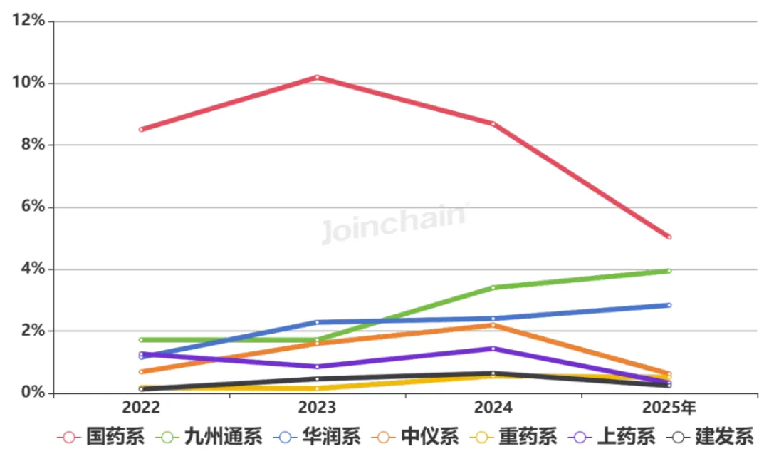 从集团系各系经销商来看,2025年排名前三的分别为国药系、九州通系和华润系经销商。各系经销商采购占比趋势变化如图表11所示。