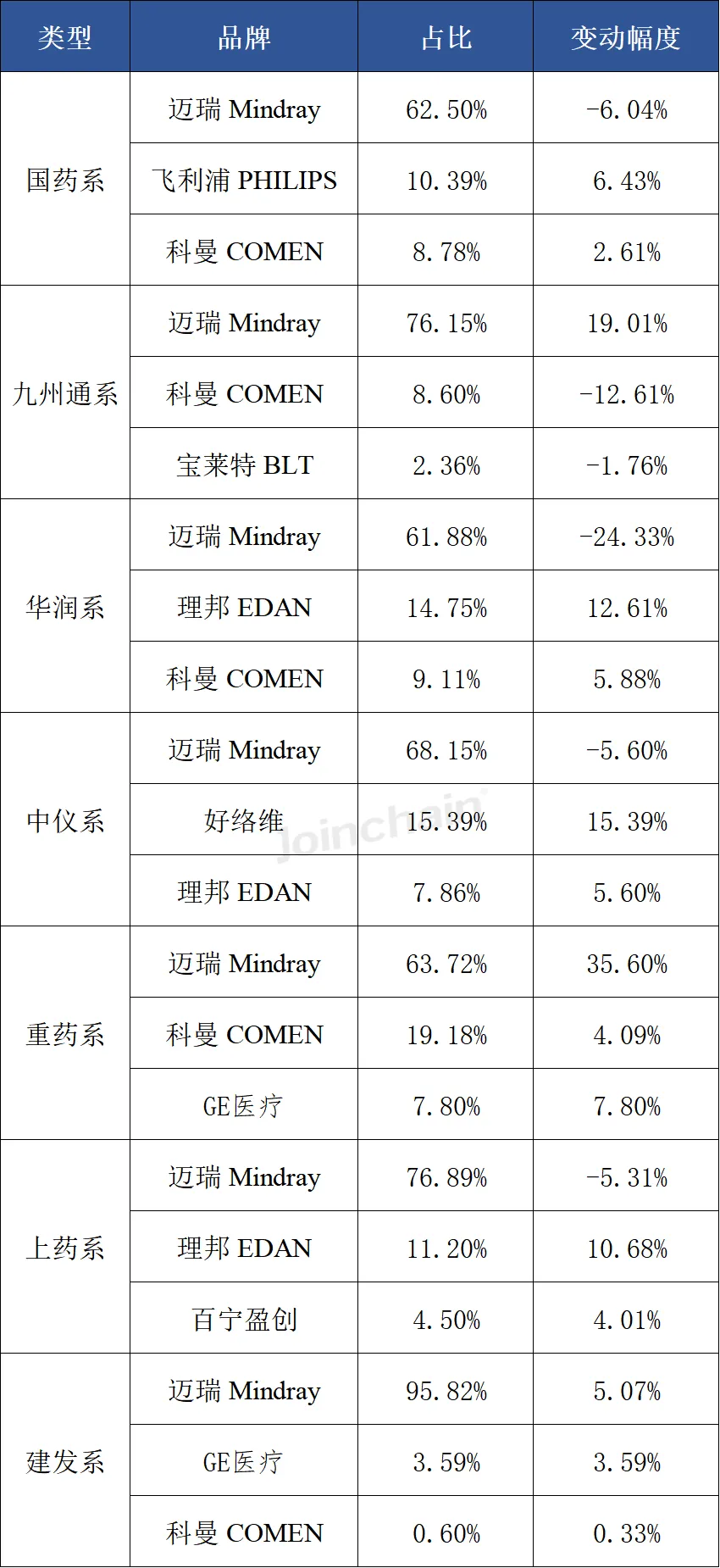 从集团系细分来看,各类型经销商品牌主要集中在迈瑞和科曼。
