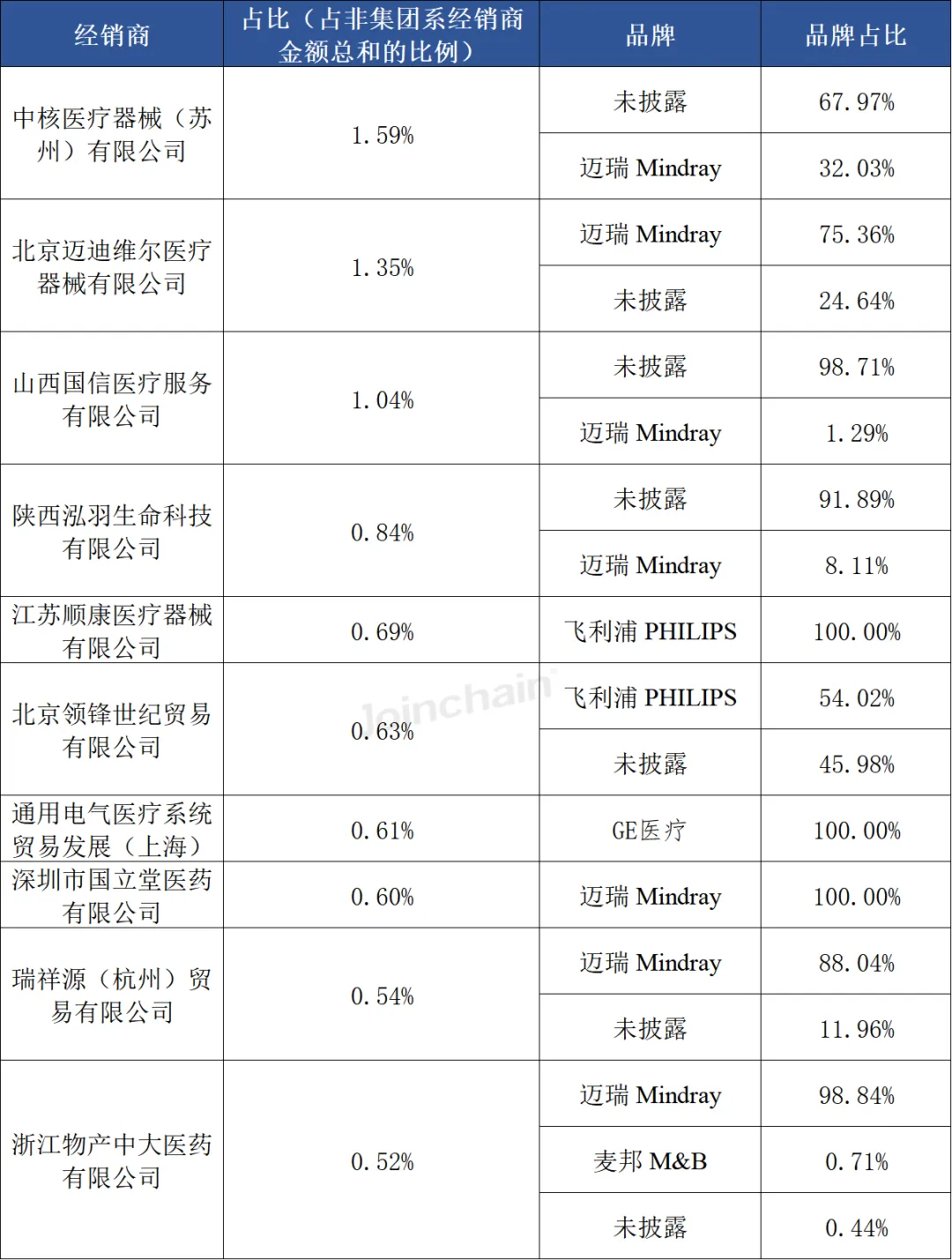 在非集团系经销商中,排名前三的分别为中核医疗器械(苏州)有限公司、北京迈迪维尔医疗器械有限公司和山西国信医疗服务有限公司。
