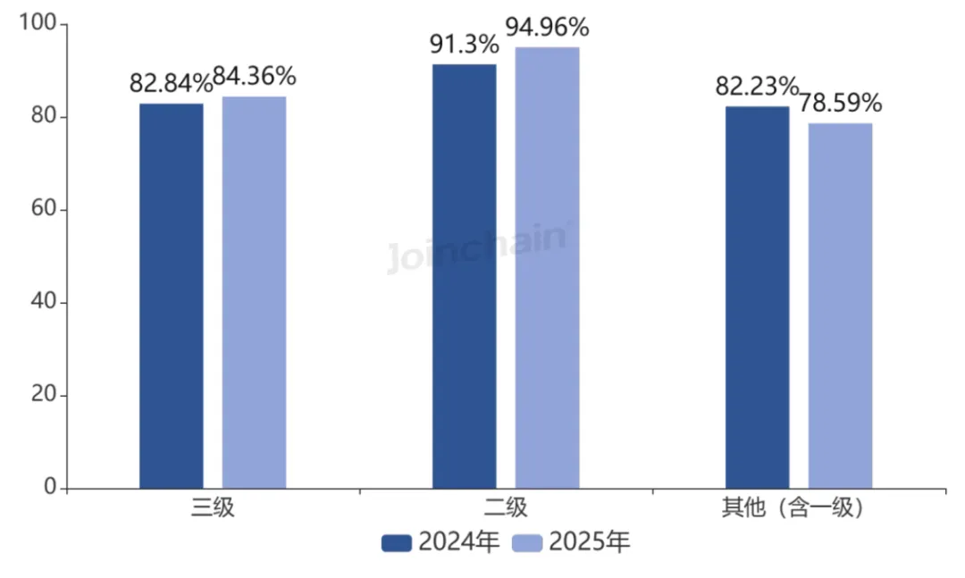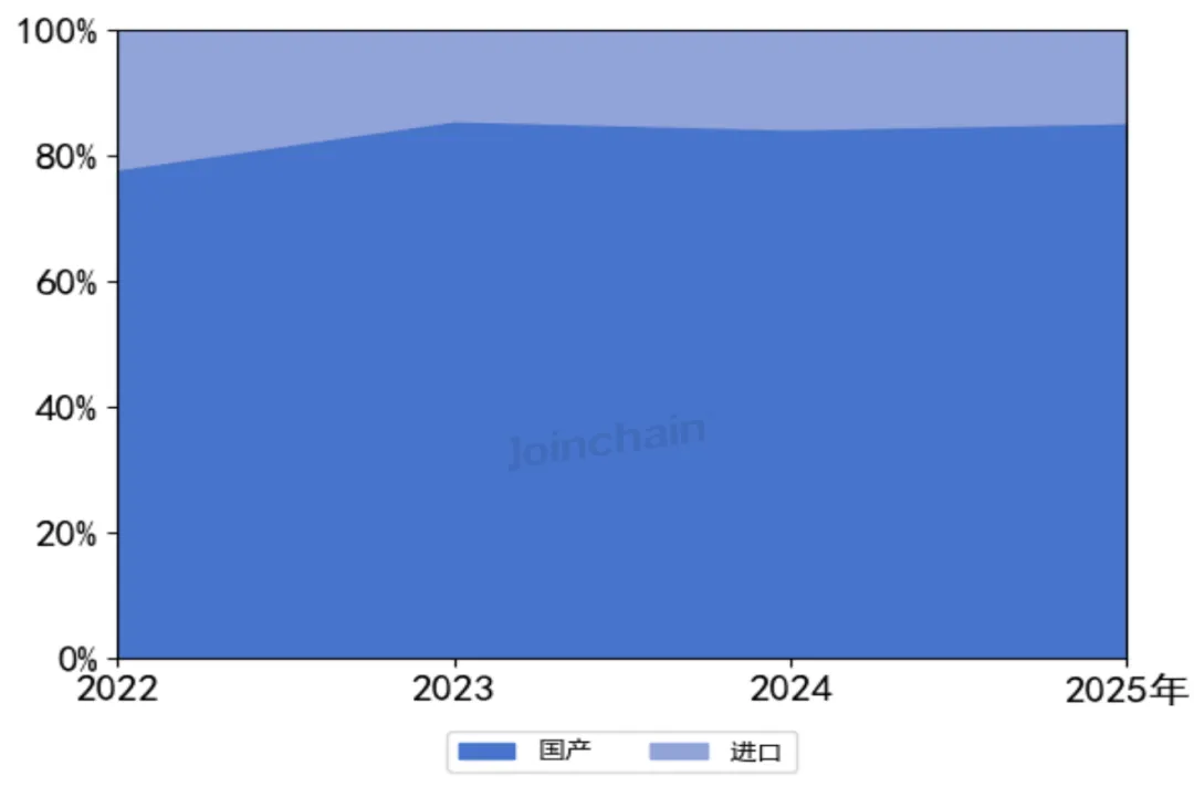 从医院品牌国产化率来看,2025年三级医院国产品牌占比为84.36%,较去年同期上升1.52%;二级医院国产品牌占比为94.96%,较去年同期上升3.66%。