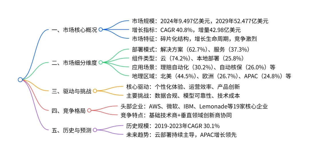 2024-2029 年全球保险行业生成式 AI 市场将以40.8% 的复合年增长率高速增长,从 2024 年的9.497 亿美元扩张至 2029 年的52.477 亿美元,增量规模达42.98 亿美元;市场呈现碎片化竞争格局,北美为最大市场(2029 年占比 44.5%)、APAC为增长最快区域(CAGR 41.4%),云部署(占比 74.2%)和理赔流程自动化(占比 30.2%)是核心细分领域,推动因素包括个性化客户体验需求、运营效率优化及风险建模创新,同时面临数据隐私合规、模型准确性及技术成本等挑战。