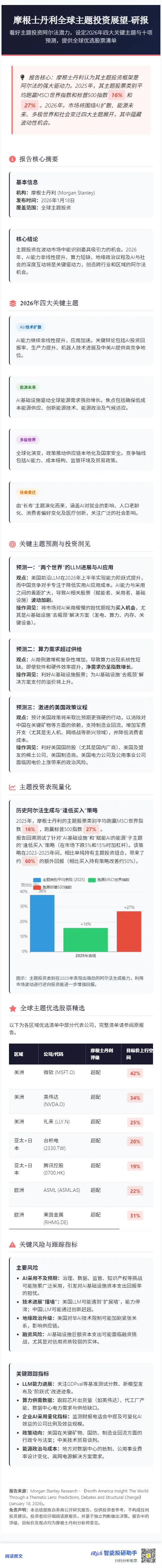 2026年将是主题投资的大年。摩根士丹利的这份研报为投资者提供了完整的分析框架和选股逻辑。在AI革命、能源转型、世界多极化和社会变迁四大趋势交织的背景下,保持战略定力、做好组合布局,有望在波动市场中获取超额收益。