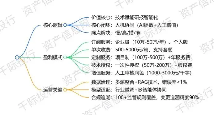 AI 写研报行业的商业模式以 “技术赋能价值创造” 为核心,围绕研报生成全流程的智能化服务,形成了多元化的盈利模式与运营逻辑,核心在于通过技术创新解决传统研报撰写的数据处理慢、成本高、易出错、覆盖窄等痛点,同时依托人工把控深度洞察与合规校验,实现 “人机协同闭环” 的服务交付。