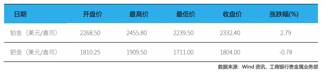 本周(1月12日 – 1月18日,下同),现货铂金开盘价为2268.5美元/盎司,最高价为2455.8美元/盎司,最低价为2239.5美元/盎司,收盘价为2332.4美元/盎司,周累计上涨2.79%。现货钯金开盘价为1810.25美元/盎司,最高价为1909.5美元/盎司,最低价为1711美元/盎司,收盘价为1804美元/盎司,周累计下跌0.78%。