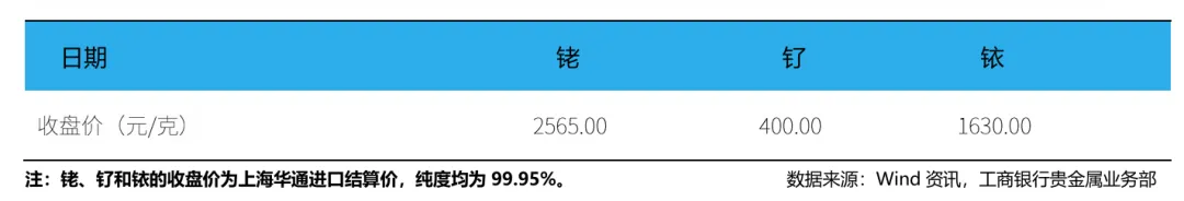 根据上海华通的数据显示,截至1月16日,99.95%现货铑金进口结算价为2565元/克,上涨3.43%。99.95%现货钌金进口结算价为400元/克,上涨4.58%。99.95%现货铱金进口结算价为1630元/克,上涨17.27%。