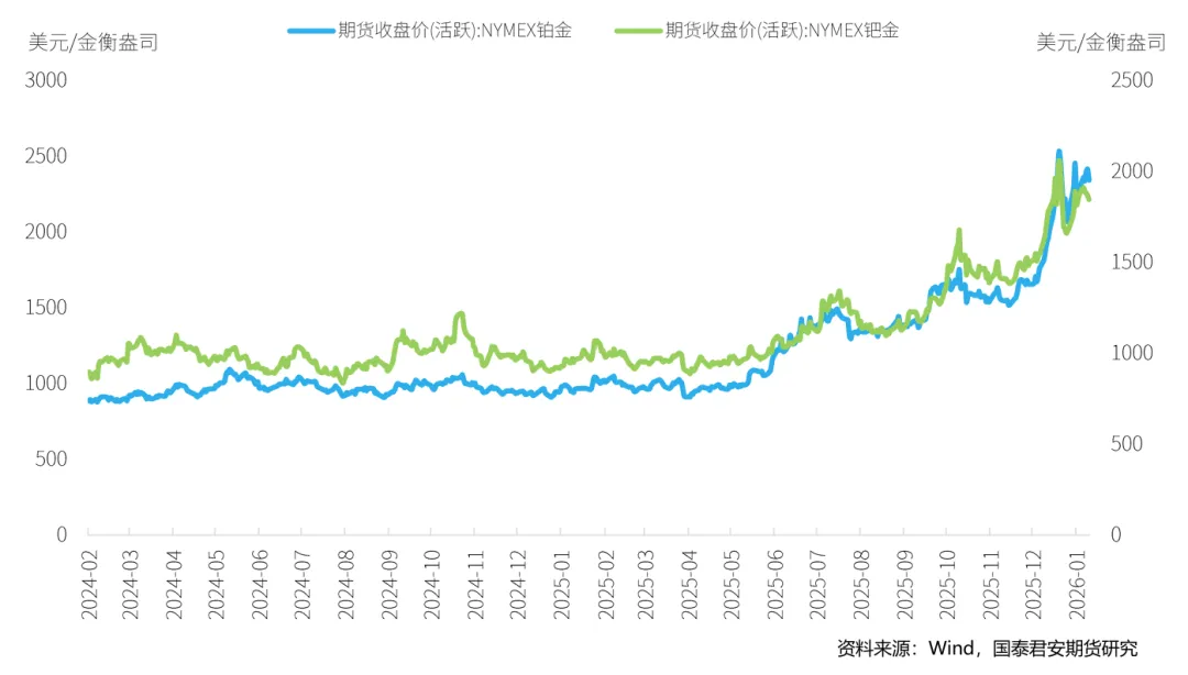 本周,铂金期货价格有所回升,截至2026年1月16日,NYMEX铂金期货价格收盘价为2342.9美元/盎司,周累计上涨2.86%。钯金方面,本周NYMEX钯金期货则回落,周五收盘价为1846.5美元/盎司,周下跌1.47%。