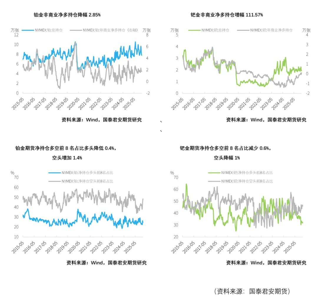 截至2026年1月13日,铂金总持仓较上周减少713张,其中非商业多头方面减少1848张,非商业空头持仓较上周减少1332张,降幅5.44%。因此,非商业净多头持仓减少516张,降幅2.85%。钯金方面,总持仓增加134张,增幅0.69%,其中非商业多头持仓增加152张,增幅1.55%,空头减少494张,降幅5.36%,因而非商业净多持仓增加646张,增幅111.57%。在净持仓多空前8名占比上,本周铂金方面净持仓多头占比降低0.4%,空头占比增加1.4%,钯金方面多头占比减少0.6%,空头占比降幅1%。