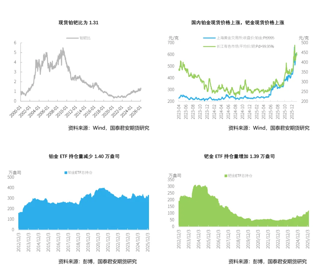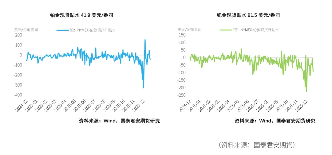 截至2026年1月16日,当周NYMEX铂金库存累库3.96万盎司,钯金期货库存去库。在现货升贴水方面,本周铂金升贴水波动较大,以周五收盘价来看贴水41.9美元/盎司。钯金则维持贴水,周五贴水91.5美元/盎司。ETF持仓量情况,铂金持仓量回落,其全球ETF持仓量本周减少1.40万盎司,钯金持仓量抬升,ETF持仓量本周增加1.39万盎司。