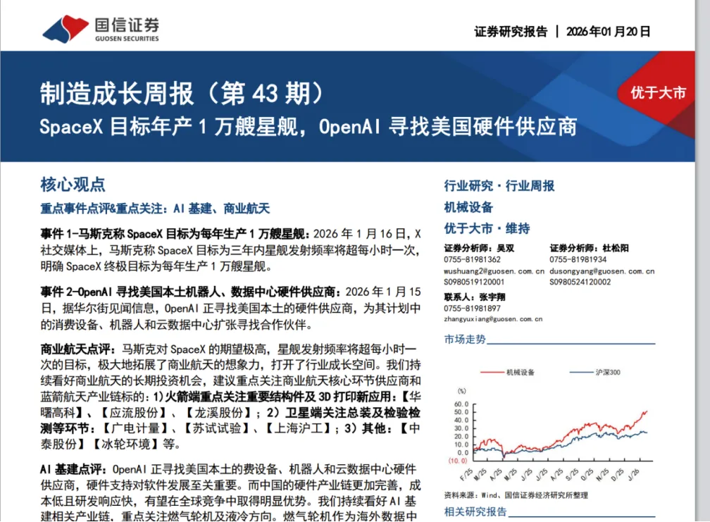 机械设备行业制造成长周报(第43期):SpaceX目标年产1万艘星舰,OpenAI寻找美国硬件供应商