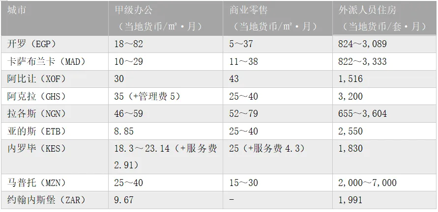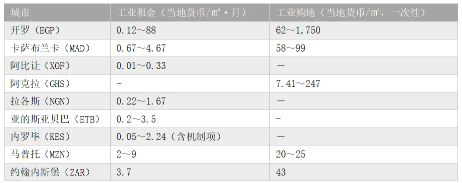 GCNR研报 | (上)非洲主要城市投资与营商成本调研比较(2025)近年来,非洲在全球经济版图中的战略地位显著提升。伴随人口增长、城镇化推进、区域经济一体化与基础设施布局的不断深化,非洲主要城市正在成为资本、产业与贸易网络的重要节点。跨国企业、金融机构与公共部门在讨论能源转型、制造业协作、港航物流、城市走廊、数字基础设施和绿色产业链布局时,对非洲城市间投资与营商成本的差异日益关注。然而,相较于宏观指标与制度性研究,关于“城市层面的投资与营商成本结构”的系统性比较研究仍然有限。本研究选取开罗、卡萨布兰卡、阿比让、阿克拉、拉各斯、亚的斯亚贝巴、内罗毕、马普托与约翰内斯堡九个具有代表性的非洲城市 ,并根据网上公开收集到的调查数据,基于成本与制度维度进行横向对照分析,旨在展现不同区域城市在投资与运营阶段的成本构成差异,为产业、金融与政策研究提供更具细节的参照框架。本研究采用“劳动力成本—土地与办公空间—公共事业费用—物流运输成本—税制与税负制度”五维体系,不进行投资建议、不进行优劣排名,也不讨论特定产业的适配性,仅呈现成本结构及制度差异,以便读者在后续分析中自行结合产业、能源、贸易与地缘场景做进一步判断。1 劳动力成本(制造业与非制造业)在劳动力成本方面,九座城市呈现出明显的梯度分布。以一般制造业工人与服务类岗位为基础观察,最低成本梯度主要出现在东非与西非部分城市,其中亚的斯亚贝巴、阿克拉与内罗毕的劳动力薪资普遍显著低于北非与南部非洲城市,无论在一般工人、服务岗位或最低工资方面均表现较低。中等成本梯度主要包括阿比让、拉各斯与马普托,劳动力成本虽整体偏低,但行业间差异显著;尼日利亚由于正式雇佣安排与通胀因素,使企业实际用工成本高于名义工资显示。较高成本梯度集中在南非与北非城市,约翰内斯堡、卡萨布兰卡与开罗在技术岗位、工程师与管理层薪资表现更高,其中南非技术岗位与中层管理岗位的成本明显高于撒哈拉以南大多数市场。区域视角显示,劳动成本低位区域主要位于东非与西非。西非城市(阿比让、阿克拉、拉各斯)的一般工人名义工资水平较低,但销售、管理与外派类岗位形成高差,内部差距显著。东非(亚的斯亚贝巴与内罗毕)整体处于中低区间,内罗毕在服务类岗位上略高于亚的斯,但仍低于北非与南部非洲。北非城市中,开罗与卡萨布兰卡在技能型岗位(工程师与中层管理)成本偏中偏高,而普通工人与服务业岗位处于中段。南部非洲则以较高的劳动力成本为特征,约翰内斯堡属于高位城市,技术岗位与管理岗位成本显著高于其他区域,马普托则呈现“中等工资+高驻在成本”的组合。总体来看,劳动力成本的跨城市差异不仅体现在工资水平,也体现在行业结构、岗位类型与雇佣模式差异等方面。不同城市的工资构成差异并不形成线性梯度,而更多呈现区域性结构与岗位分层特征。表1-1:制造业岗位(单位:当地货币)表1-2:非制造业/零售/服务岗位(单位:当地货币)表1-3:法定最低工资(单位:当地货币)备注:当地货币种缩写: EGP(埃及镑)/ MAD(摩洛哥迪拉姆)/ XOF(西非法郎)/ GHS(加纳塞地)/ NGN(尼日利亚奈拉)/ ETB(埃塞俄比亚比尔)/ KES(肯尼亚先令)/ MZN(莫桑比克梅蒂卡尔)/ ZAR(南非兰特)2 土地与办公成本 ( 土地/厂房/办公/住房 )在土地与城市空间相关成本方面,工业用地、仓储设施与商业办公租赁的价格表现与劳动力成本的排序存在明显差异。整体来看,内罗毕、阿克拉与亚的斯亚贝巴的工业用地与办公空间成本相对较低,拉各斯、阿比让与马普托处于中段,而卡萨布兰卡与约翰内斯堡的办公物业成本则处于较高区间。开罗部分核心地段的甲级办公租赁价格高于西非城市,但同城差异较大,表明土地与办公成本在同一城市内部也呈现出显著的空间分层。从工业用地和厂房租金看,城市间差异幅度显著高于工资差异,呈现出由西非与东非的低位组合向北非的中位再到南部非洲高位的梯度结构。阿比让、亚的斯亚贝巴与内罗毕的工业租金水平处于样本中的低位,而马普托与约翰内斯堡则形成高位区间,沿海港口城市的工业地成本普遍更高。商业办公与驻留房产的成本结构则与工业用地的排序不同。拉各斯与阿比让的办公租金处于较高位置,而约翰内斯堡的办公租赁成本反而位于中低区间,亚的斯亚贝巴为样本最低之一。商业零售租金在卡萨布兰卡、拉各斯与阿比让表现突出,而常驻人员住房成本在拉各斯、阿克拉、马普托与约翰内斯堡普遍处于中高至高段。总体而言,工业用地、办公空间与住房成本之间并不存在同步变动关系,工业地价格水平无法直接推断商业办公与住宅市场的成本表现,显示出土地与城市服务空间属于不同的价格体系。表2-1:土地成本比较表(工业租金 + 工业购地)表2-2:办公与商务成本比较表(甲级办公+商业零售+外派住房)3 公共事业费用(电、水、燃料、天然气/LPG)公共事业成本的差异与各国能源结构、供电形态、政策机制与市场化程度高度相关。整体来看,电价水平在水电占比高、政策支持工业用电或存在电价补贴的国家处于相对低位,如埃塞俄比亚的水电体系带来较低名义电价,摩洛哥通过工业电价政策降低生产成本,埃及仍保留一定补贴机制。相较之下,尼日利亚长期缺电、自备发