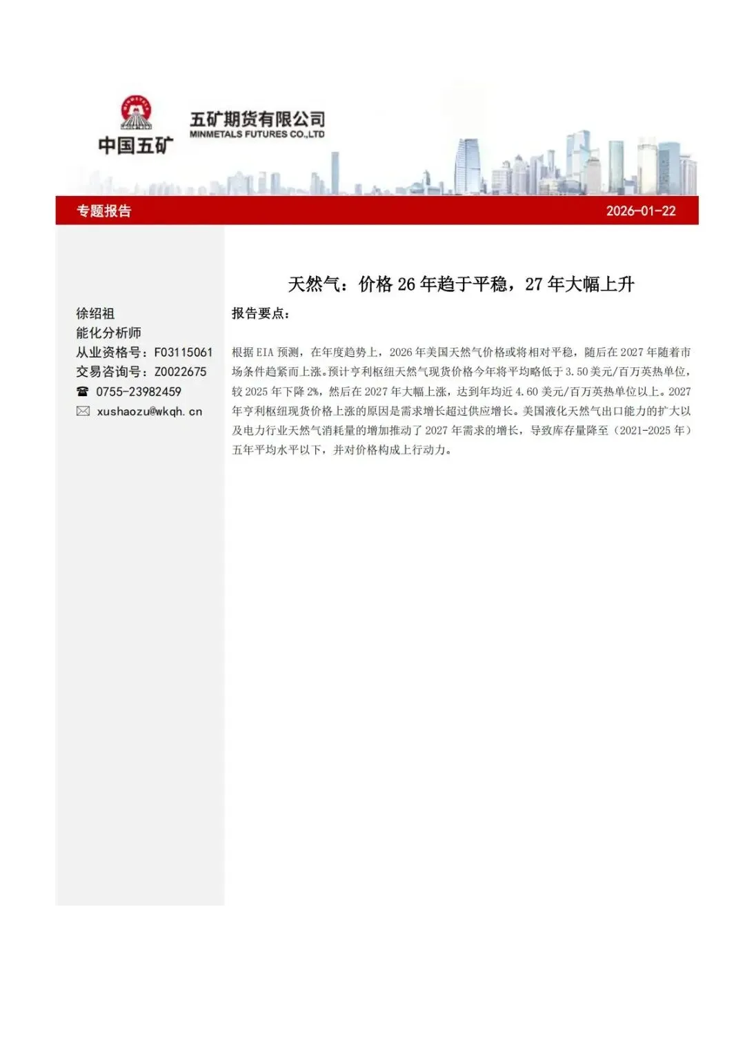 『研报』天然气:价格26年趋于平稳,27年大幅上升