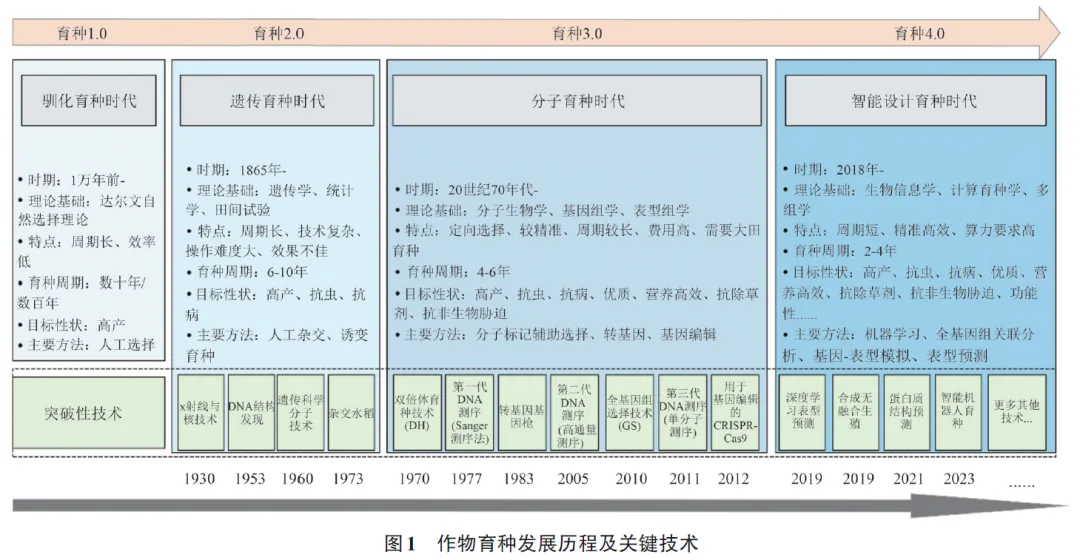 4.0 智能设计育种(定制时代): 始于2018年。不再是单点突破,而是系统设计。利用AI、机器学习和全基因组关联分析,对基因-环境-表型进行模拟和预测,实现“精准设计、定向培育”。