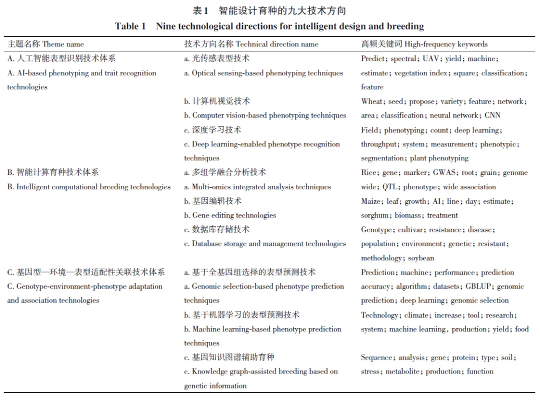 基于全球1544篇核心文献的大数据挖掘,智能设计育种的技术版图已经清晰浮现。全球研究热点主要集中在三大主题、九大关键技术方向 。