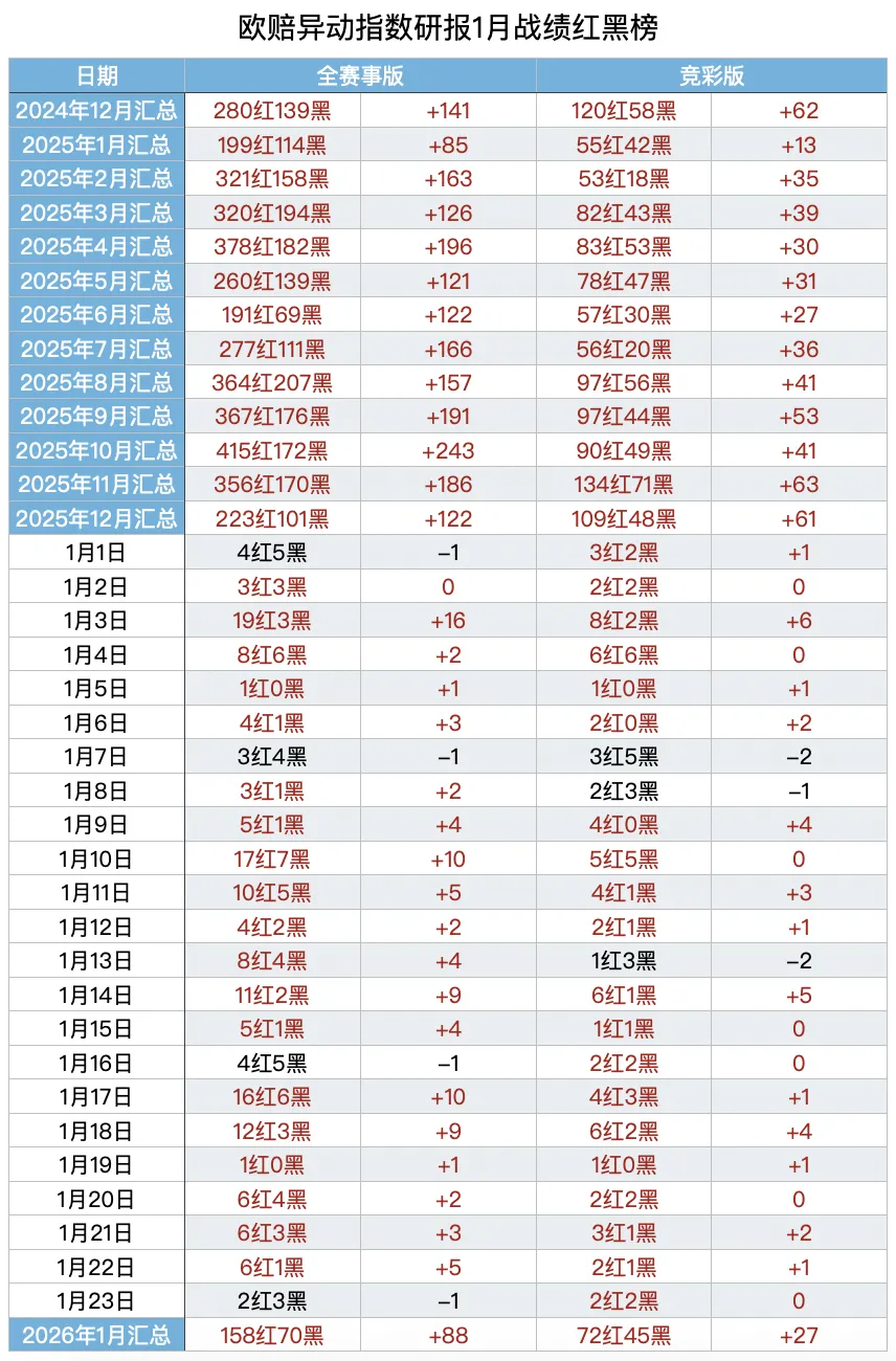 【欧指异动指数】(全赛事版)栏目的研报给出5场比赛,2红3黑,1月累计158红70黑,净胜88,观察20家主力公司的临场指数变化,掌控比赛方向,1月稳定性达到69.3%。