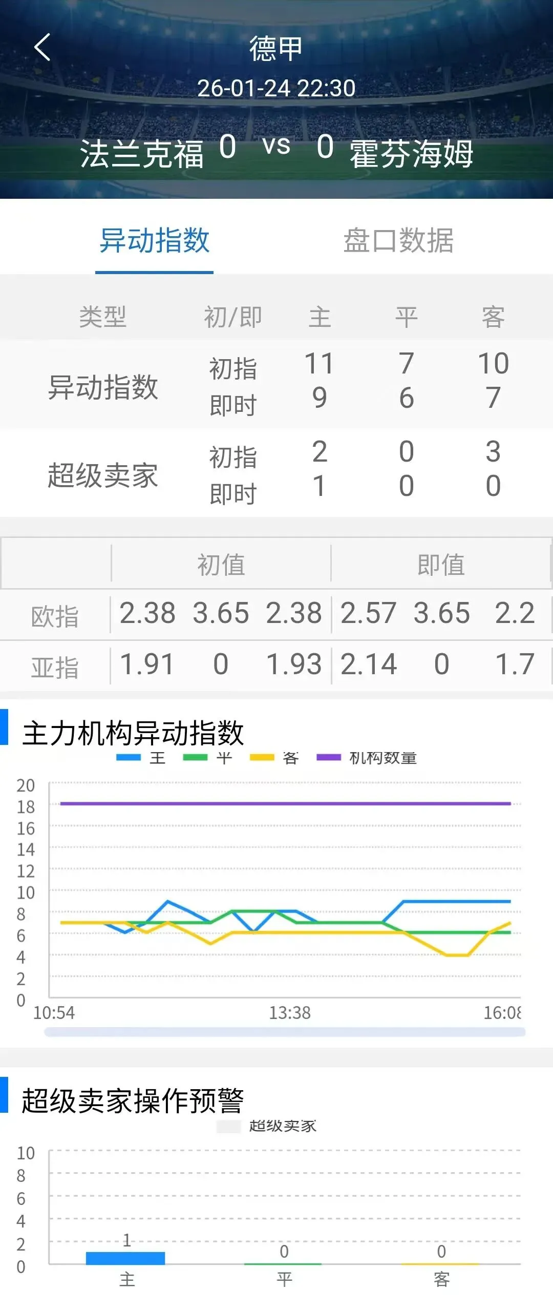 霍芬海姆本赛季堪称超级黑马,击败勒沃库森后,他们已经高居第3。霍村的成功秘诀是打法极为强硬,犯规次数联赛第一,通过高强度逼抢,确实能得到不少反击机会。此外,霍村引进了一套“科索沃中轴线”,三名科索沃球员撑起球队的攻防脊梁,边路球员也敢大胆前插,打出了两翼齐飞的效果。更离谱的是,霍村8个客场拿到15分,他们9个主场才18分,当前客战战绩排名第3,不败率接近9成。法兰克福贵为上届季军,本赛季出现下滑,当前排名第7,他们主场表现依旧不俗,不败率75%且胜率5成。然而法兰克福近期防守不佳,近4场正赛居然全部丢3球,导致只有2平2负的战绩。法兰克福主场对敌3连胜,但那时的霍村只是鱼腩,与如今的超级黑马绝非一类,因此往绩难以作为参考。本场究竟如何走势,来看指数的研报。