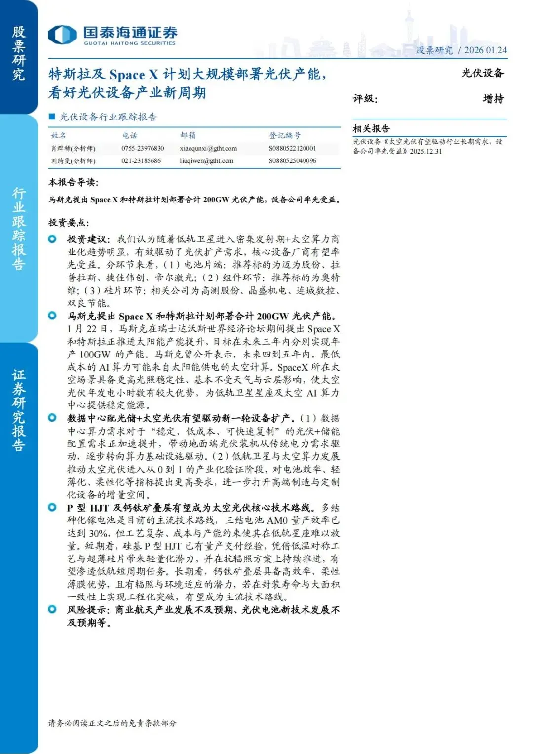 事件催化:马斯克在达沃斯论坛宣布,SpaceX和特斯拉目标3年内年部署100GW光伏产能,用于太空算力和地面数据中心,推动光伏设备需求。