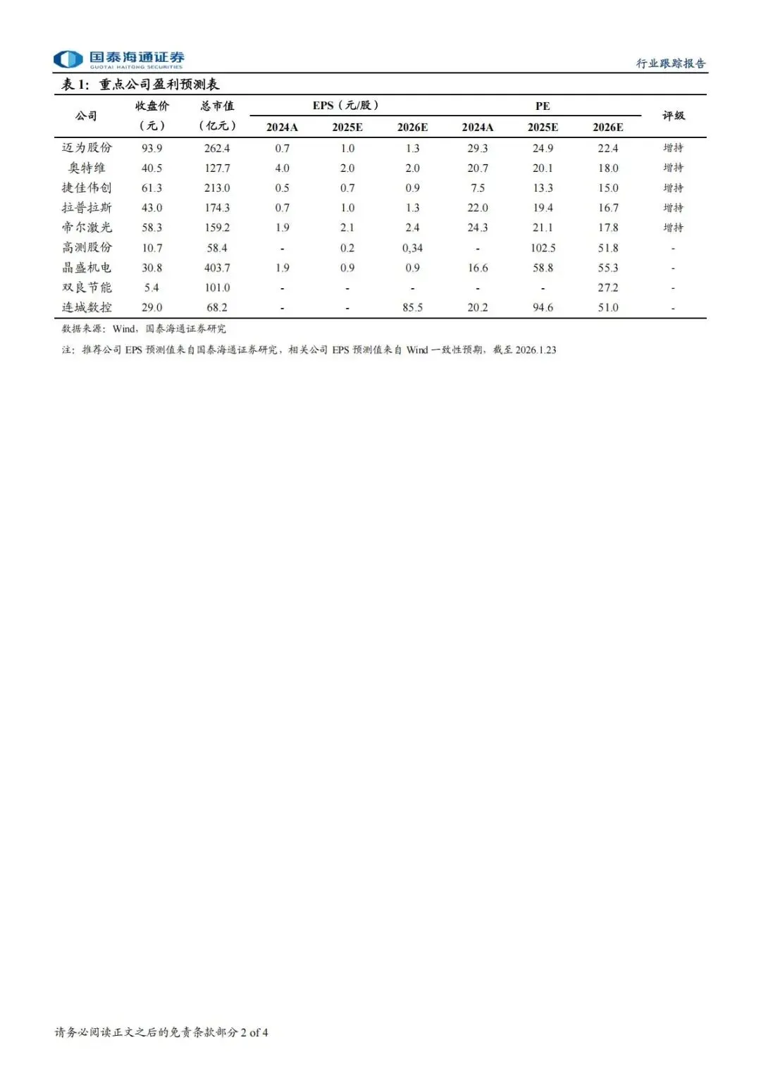 投资建议:推荐设备厂商——电池片设备(迈为股份、拉普拉斯、捷佳伟创)、组件设备(奥特维)、硅片设备(高测股份、晶盛机电)。