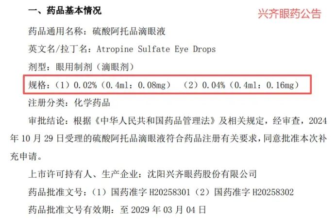 1月初,兴齐眼药公告称,公司已经收到硫酸阿托品滴眼液《药品补充申请批准通知书》,新增两个产品规格:0.02%(0.4ml:0.08mg)、0.04%(0.4ml:0.16mg)。
