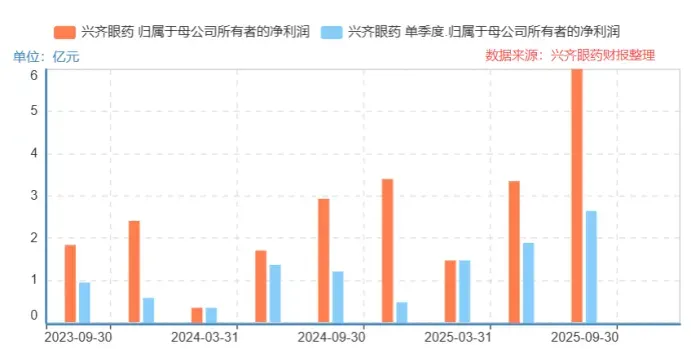 在此基础上,我们发现,兴齐眼药2024年以来业绩更出现了加速增长态势。2024年实现净利润3.38亿,同比大增40.8%,2025年前三季度净利润5.99亿,同比剧增106%。
