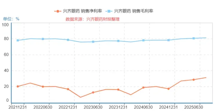 数据显示,兴齐眼药的毛利率和净利率近些年改善明显,其中毛利率从2023年的77.37%提高到了2025年三季度的81.33%;而净利率从16.36%一举攀升到了31.46%,可见新品对盈利能力的带动有多强。