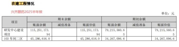 同时,未来快速满足需求,兴齐眼药也进行了产能扩张。财报数据显示,公司自建工程从2022年的仅仅7000万,直接提高到了2025年三季度的3.8亿。而从公司更详细的2025年半年报中可以看到,激增的在建工程,除了研发中心建设,就是扩建各个厂区,有利于快速应对需求。