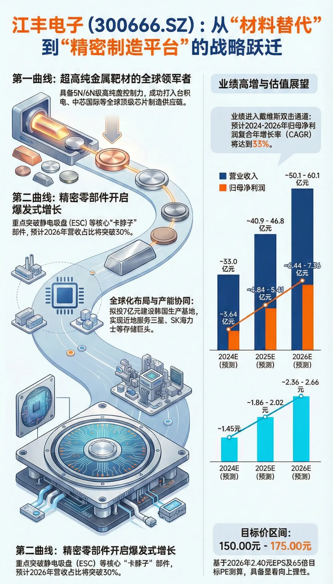 可比公司锚定:虽然江丰电子常被归类为材料公司,但考虑到其零部件业务的高成长性,其估值体系应介于半导体材料(通常40-50倍PE)与半导体设备(通常60-80倍PE)之间。成长性溢价:鉴于未来三年30%以上的复合增速以及在核心卡脖子领域的稀缺性,市场理应给予其一定的估值溢价(PEG > 1.5)。6.2 目标价推导