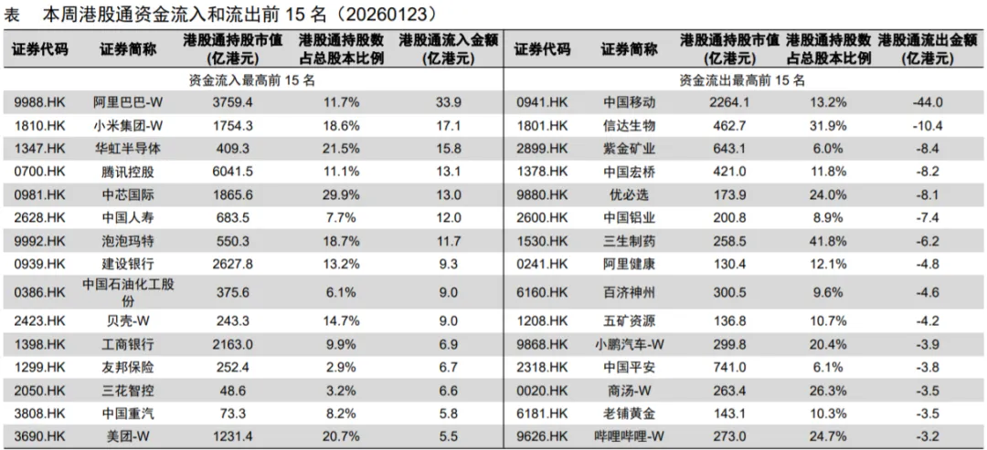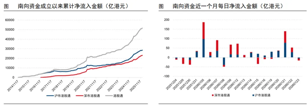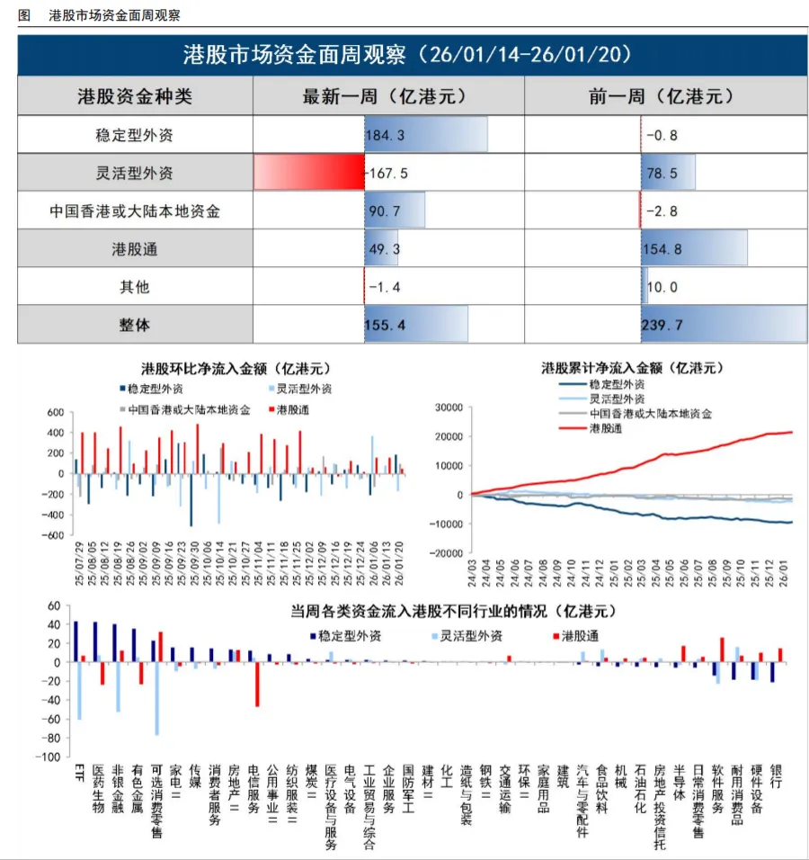 港股市场:长线外资流入,短线外资流出。根据港交所中央结算系统持股明细数据最近一周(2026/1/14-2026/1/20)各类资金合计流入港股市场155亿港元,其中稳定型外资流入184亿港元,灵活型外资流出167亿港元,港股通流入49亿港元,中国香港或大陆本地资金流入91亿港元。行业层面,最近一周外资流入医药生物、有色金属、房地产等较多,港股通流入可选消费零售、软件服务、半导体等较多。