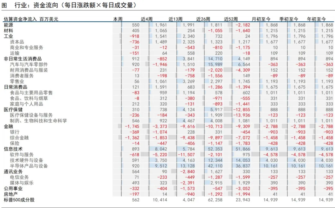 资金流向:整体流动与行业内流向均较缓本周,标普500成分股估算资金流(涨跌额x成交量)为+5.6(亿美元,下同),上周为-1.7,近4周为+104.1,近13周为+40.5。11个行业资金流入,13个行业资金流出。资金流入的主要有:汽车与汽车零部件(+9.2)、半导体产品与设备(+9.2)、技术硬件与设备(+5.9)、能源(+5.5)、制药生物科技和生命科学(+5.5);资金流出的主要有:综合金融(-13.6)、资本品(-7.4)、软件与服务(-6.2)、银行(-3.7)、公用事业(-3.3)。