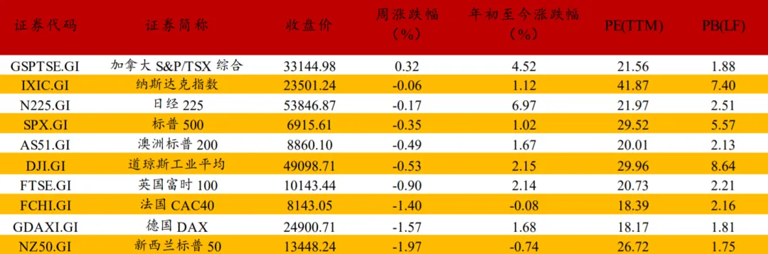 由于格陵兰岛的地缘问题发展,本周欧洲多数市场出现了明显震荡。由于欧洲经济景气度存在压力,欧洲多个重要市场股指市净率偏高,叠加一些复杂的地缘问题因素,预计法国CAC40、德国DAX、英国富时100、意大利富时MIB、欧洲STOXX50、欧洲STOXX600等欧洲重要市场指数中期维度仍容易趋于震荡。
