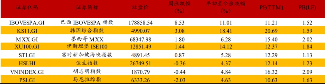 从亚太市场来看,韩国市场和日本市场的部分AI资产阶段估值仍然偏高,预计中期维度仍然容易出现调整。由于经济基本面或美国贸易政策等因素或估值问题的潜在影响,预计阿根廷MERVAL、巴西IBOVESPA、韩国综合指数、印度SENSEX30等海外新兴市场指数容易出现波动。