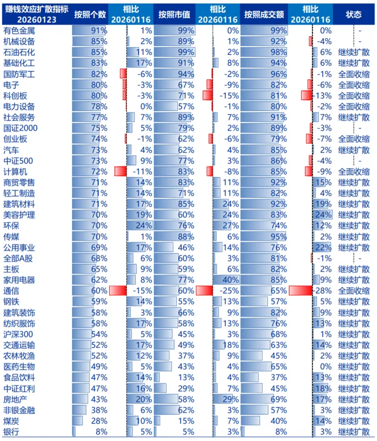 ⚫开门红行情提前进入板块轮动阶段,但春季行情演绎的既定路径尚未被破坏。春季行情的既定路径:春季增量博弈(年前中证A500ETF冲量,年后保险开门红、外资回流预期为基础;居民增配权益+交易性资金活跃度提升+存量加仓成为边际资金)+有利于做多窗口连续(1月在排除经济下行风险的前提下,市场下行风险较小,2月期待春节科技催化,3月两会十五五落地,4月特朗普可能访华),市场具备完美春季行情的基础,核心特征是完整的板块轮动和充分的赚钱效应扩散。短期,产业趋势主题有所调整,底部资产挖掘走向深化。周期Alpha投资向周期拐点方向扩散,且短期股价有弹性。短期超跌的产业趋势主题,演绎反弹行情,其实也是底部资产挖掘的一部分。