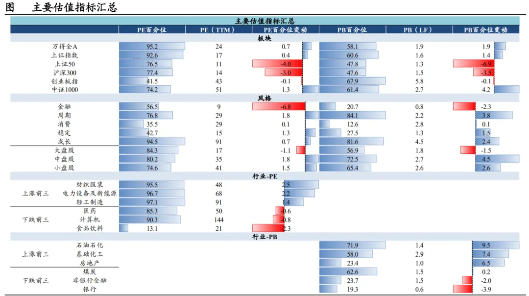盈利预测:整体维持稳定,能源下修较显著本周,标普500成分股动态未来12个月EPS预期+0.2%,上周+0.3%。21个行业盈利预期上升,3个行业盈利预期下降。上修的主要有:房地产(+2.0%)、半导体产品与设备(+0.7%)、材料(+0.7%)、资本品(+0.5%)、技术硬件与设备(+0.5%);下修的主要有:能源(-2.0%)、耐用消费品与服装(-0.7%)、电信业务(-0.1%)。