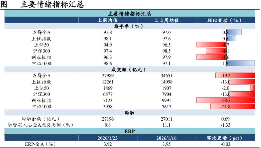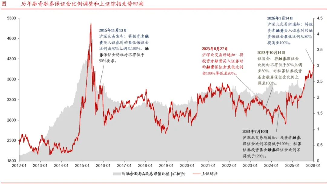 本轮“非典型春季躁动”始于2025年12月下旬。2025年12月下旬,在外围BTC期货+美股波动+日央行加息落地后,A500ETF申购份额连续上升叠加商业航天叙事推动,市场风险偏好企稳回升。美元偏弱震荡、央行汇率中间价偏强叠加年末结汇动能增强,12月末人民币汇率“稳中有升”,美元兑人民币汇率离岸价下破7.0关口。元旦过后,A股实现“开门红”,1月上旬上证综指一举升破4100关口。资金面来看,2026年大量3Y+5Y居民定期存款到期,公募权益基金发行回暖,A股配置吸引力有望引导居民储蓄进一步入市。2026年1月14日,沪深北交易所宣布将A股融资保证金最低比例从80%提高至100%。我们认为此举主要为了引导A股“慢牛”行稳致远。