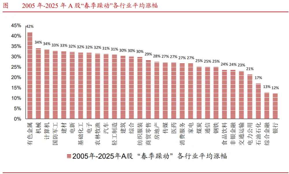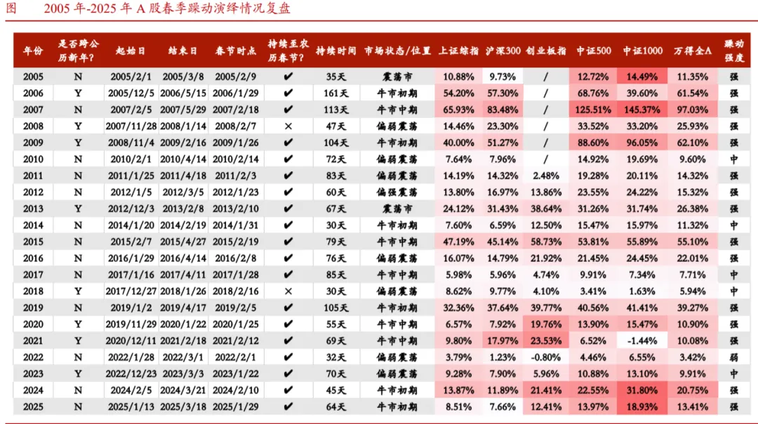 核心观点“春季躁动”可视为全年走势前瞻,其催化主要来自年初政策预期偏强、央行流动性投放、经济数据及财报真空期等因素叠加。年末结汇+汇率升值与A股春季行情亦往往形成顺周期共振。我们回溯2005年-2025年春季行情发现:春季行情平均持续70天,上证平均涨20%。领涨板块来看,成长、消费和顺周期风格及有色、机械、计算机、军工、建材、电新、化工、电子等行业占优。本轮“非典型春季躁动”始于2025年12月下旬外围不确定性落地、A500ETF申购份额上行及商业航天叙事带来的风偏改善。据统计规律,我们预计这波春季行情会持续到马年春节前后,乐观视角可持续至3月上旬。资金面看,3Y+5Y居民定期存款到期+公募权益基金发行回暖+保险资金增配权益,增量资金有望进一步入市。配置方面,降温之下市场或以短期震荡+降波为主,季度视角看,我们认为“系统性慢牛”依旧可期;行业方面,1月下旬步入A股年报业绩验证窗口期,板块风格或转向业绩与弹性兼具的“两电化非机”+中小成长。