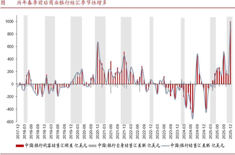 (3)跨资产层面,汇率和A股有望延续顺周期共振。2026年美联储降息周期延续的确定性较高,至1月22日,CME利率期货定价2026年美联储降息2次左右,累计降息空间为50bp左右。中美货币政策周期差有望延续收敛,10Y中美利差倒挂程度有望收窄,跨境资本流动有望支撑人民币汇率温和升值,年内美元兑人民币离岸价USDCNH有望触及6.8关口。2018年-2025年美国在中国出口份额中占比从19%下降至11%,中国出口目的地多元化的背景下,汇率适度升值对外贸影响有限。2025年12月,商业银行自身与代客结汇合计达到1000亿元,为近十年新高。资产联动视角来看,人民币汇率的温和升值有望从跨境资金增配和本币计价资产重估角度推动A股系统性“慢牛”演绎再上台阶。