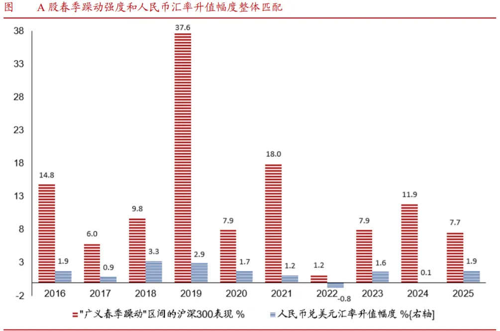启示Ⅲ:年末结汇增多+汇率升值与A股春季行情形成顺周期共振。从跨资产角度,人民币汇率和A股存在顺周期共振。年末人民币汇率往往受结汇动能季节性增强而呈现“稳中有升”,恰好对应A股的春季躁动。例如2019年年初的春季行情中,沪深300涨幅高达37.6%,人民币对美元离岸汇率亦升值近3%。q
