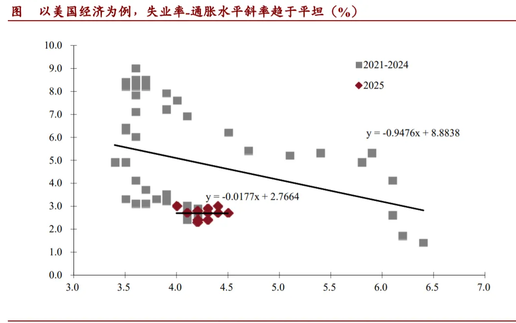 菲利普斯曲线趋于平坦,贝弗里奇曲线整体外移。传统菲利普斯曲线将失业率视为衡量劳动力市场紧张程度的核心变量,隐含假设是:失业率下降意味劳动力市场偏紧,伴随工资加速上行将推升通胀水平。然而,AI的引入正在系统性削弱这一传导链条。首先,有效劳动供给的弹性显著上升。AI扩展了单个劳动者可完成的任务集合,即便就业人数不变,单位产出所需的劳动投入亦在下降,使得失业率下降不再必然对应同等强度的用工约束。其次,工资形成机制出现明显分化。AI并未推高整体工资水平,而是强化了工资结构的分层:不可被替代任务获得溢价,而可被自动化任务面临持续压制,从而降低了平均工资对劳动力紧张程度的敏感性。再次,生产率提升对成本冲击形成缓冲,AI通过降低单位边际成本,削弱了工资变动向价格端的传导。综合来看,菲利普斯曲线的斜率正在趋于平坦,通胀对失业率的相关性下降,对技术扩散速度与任务结构变化的依赖上升。相较菲利普斯曲线,AI对贝弗里奇曲线的影响更为直观。AI替代主要集中于中等技能岗位,而再培训、技能转移与跨区域流动存在显著摩擦,导致相同职位空缺率对应更高的失业率,贝弗里奇曲线整体外移。企业新增岗位更多指向高技能、复合任务及人机协作型职位,而失业人口则集中于被AI替代的任务类型,形成结构性错配。AI参与生产的环境下,职位空缺数据本身的信息含量有所下降。部分职位空缺更多反映的是对AI系统的补充配置或探索性需求,而非等量的劳动需求,这使得职位空缺率作为劳动力市场紧张度指标的解释力亦持续弱化。