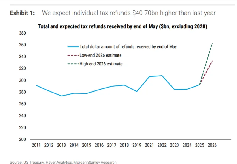关键数据: 摩根士丹利预计,今年的个人退税额将比去年高出400亿至700亿美元。如果收到退税的消费者数量保持不变,平均退税规模将增加550美元,达到约3500美元的历史高位。