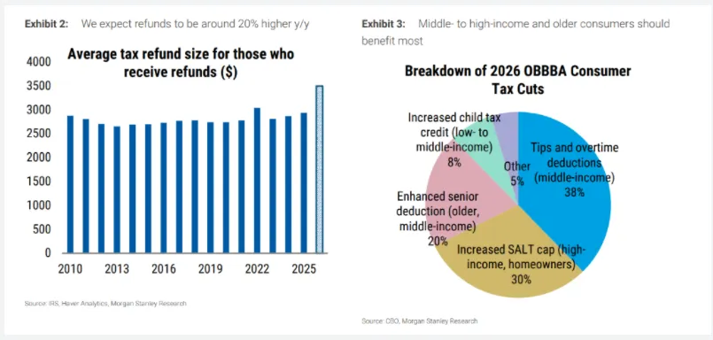 摩根士丹利指出,因追溯性减税政策生效,美国消费者将在2026年第一季度收到总额约3500亿美元的退税,同比激增20%。这笔“现金雨”将短期提振消费,但因主要流向中高收入及老年群体(其消费意愿较低),对经济增长的实际拉动有限,且难以抵消高关税与进口疲软带来的结构性压力。