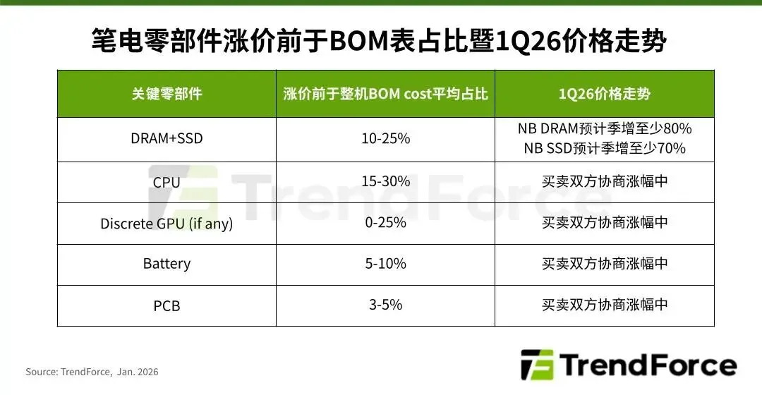 存储器、CPU、PCB、电池、电源管理IC等零部件同步涨价,笔电成本压力扩大;