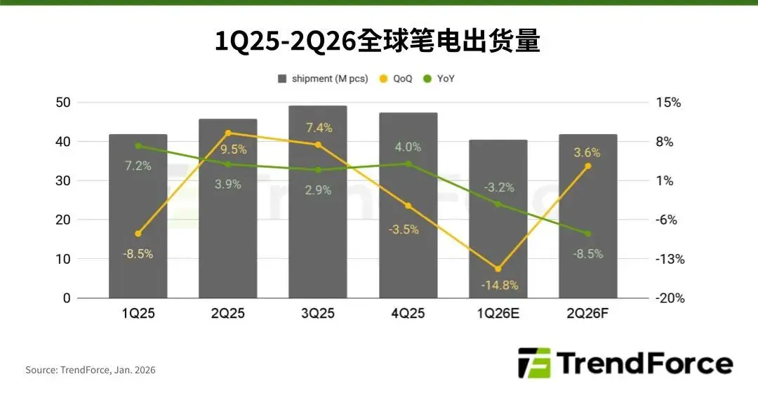 预估1Q26全球笔电出货季减14.8%,2Q26有望温和季增;