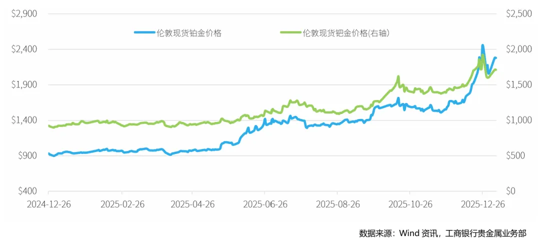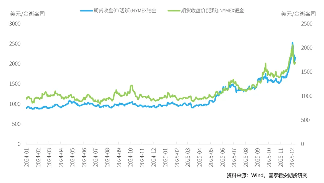 本周,铂金期货价格有所回落,截至2026年1月2日,NYMEX铂金期货价格收盘价为2161.8美元/盎司,周累计下跌4.89%。钯金方面,本周NYMEX钯金期货同样回落,周五收盘价为1695.5美元/盎司,周下跌6.89%。